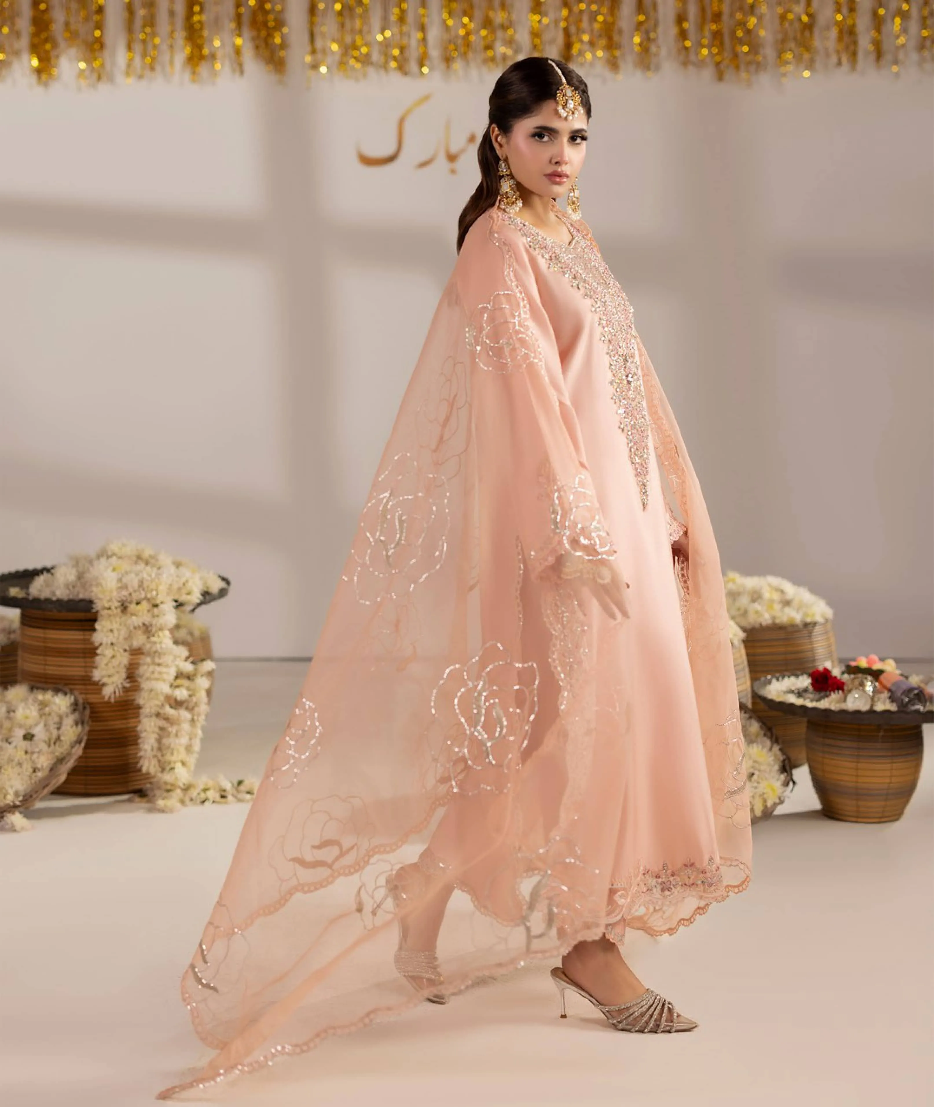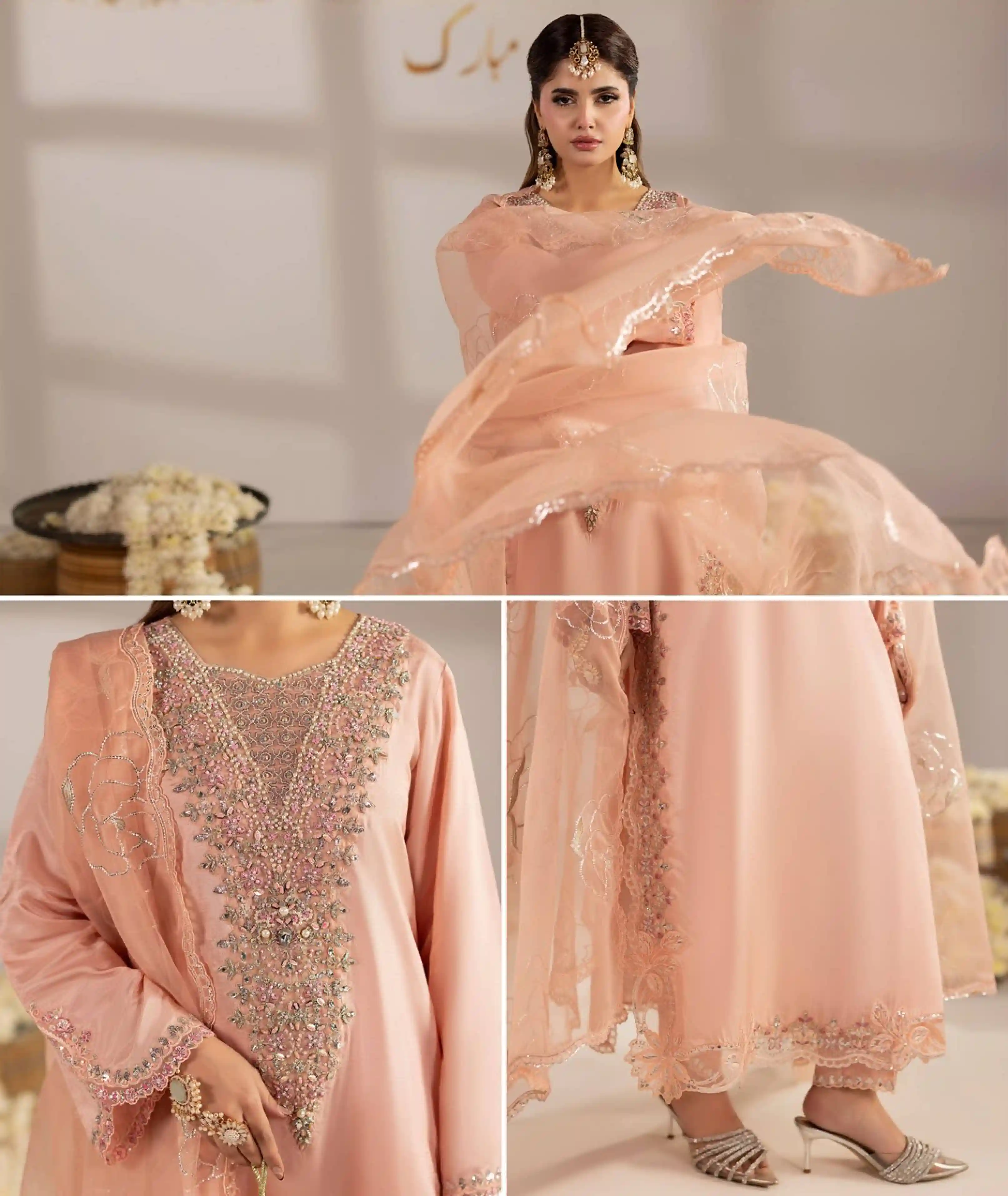 Celebrate festive occasions in style with this elegant Pakistani Three-Piece Set, crafted from premium raw silk and organza fabrics. Perfect for weddings, parties, and special events, this outfit combines comfort with traditional sophistication.