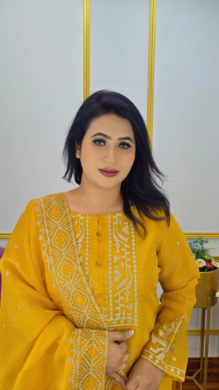 The dress features intricate Zari Suta embroidery, traditional Jamdani motifs, and a beautifully designed tassels work dupatta that adds a touch of heritage elegance. Extra sleeves fabric is included, offering flexibility in design and modest styling options.