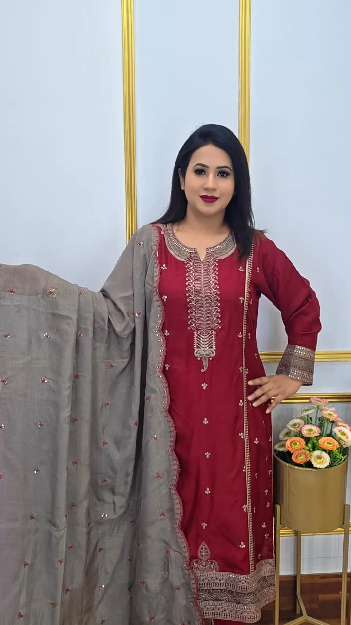 The perfect combination of elegance and comfort with this stunning unstitched three-piece suit featuring full sequence embroidery work. Crafted from premium maslin silk with generous fabric for size 56+, this complete set offers luxurious sparkle and customization freedom.
