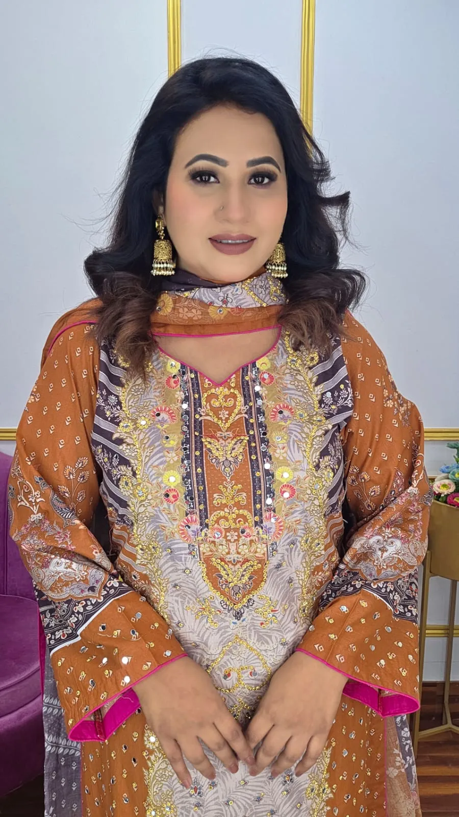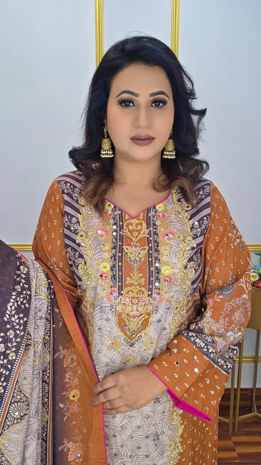 This stunning unstitched three-piece suit featuring vibrant digital print and beautiful stone work. Crafted from premium pure cotton with extra generous fabric for size 80+, this complete set offers style, comfort, and customization freedom at an incredible value.