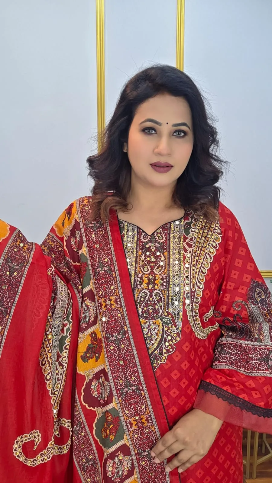 Crafted from breathable pure cotton, the set includes a richly patterned digital print on the body and orna, giving you a modern, eye‑catching look. Elegant mirror work and subtle stone work provide just the right amount of sparkle without feeling overdone, so you can easily dress it up or keep it casual. The included cotton pant completes the outfit, letting you tailor everything to your fit and style.