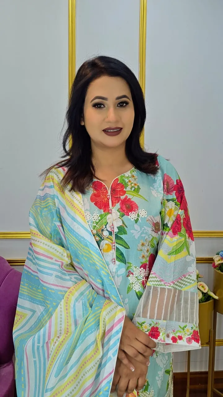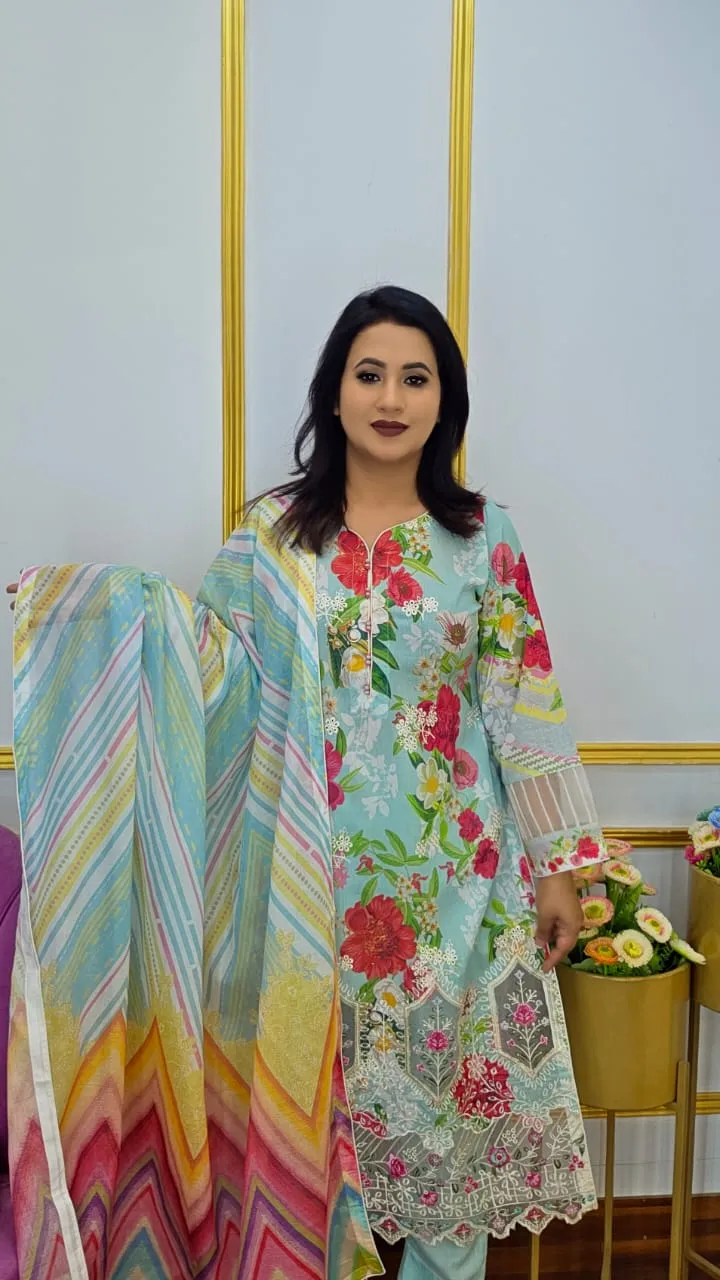 Your everyday and festive wardrobe with this elegant Unstitched Three Piece Set, crafted from premium pure cotton fabric that ensures breathability, softness, and all-day comfort. The outfit features a beautiful digital print enriched with boring embroidery work, giving it a refined and graceful look that stands out effortlessly.