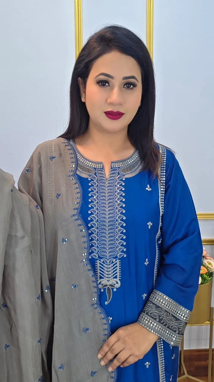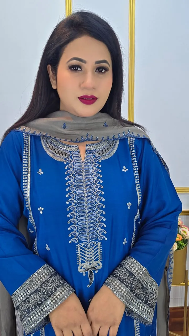 Discover the perfect combination of elegance and comfort with this stunning unstitched three-piece suit featuring full sequence embroidery work. Crafted from premium maslin silk with generous fabric for size 56+, this complete set offers luxurious sparkle and customization freedom.