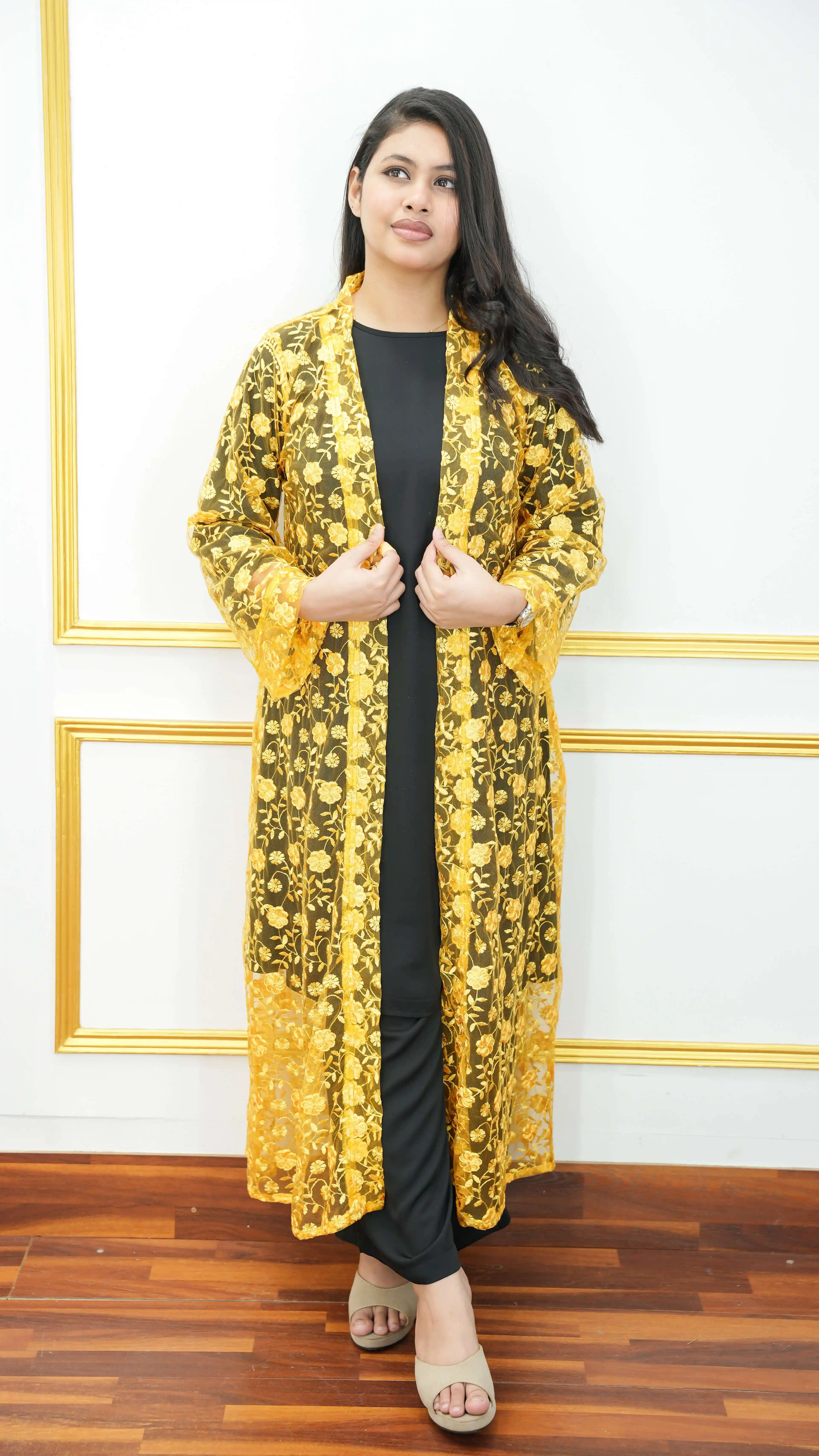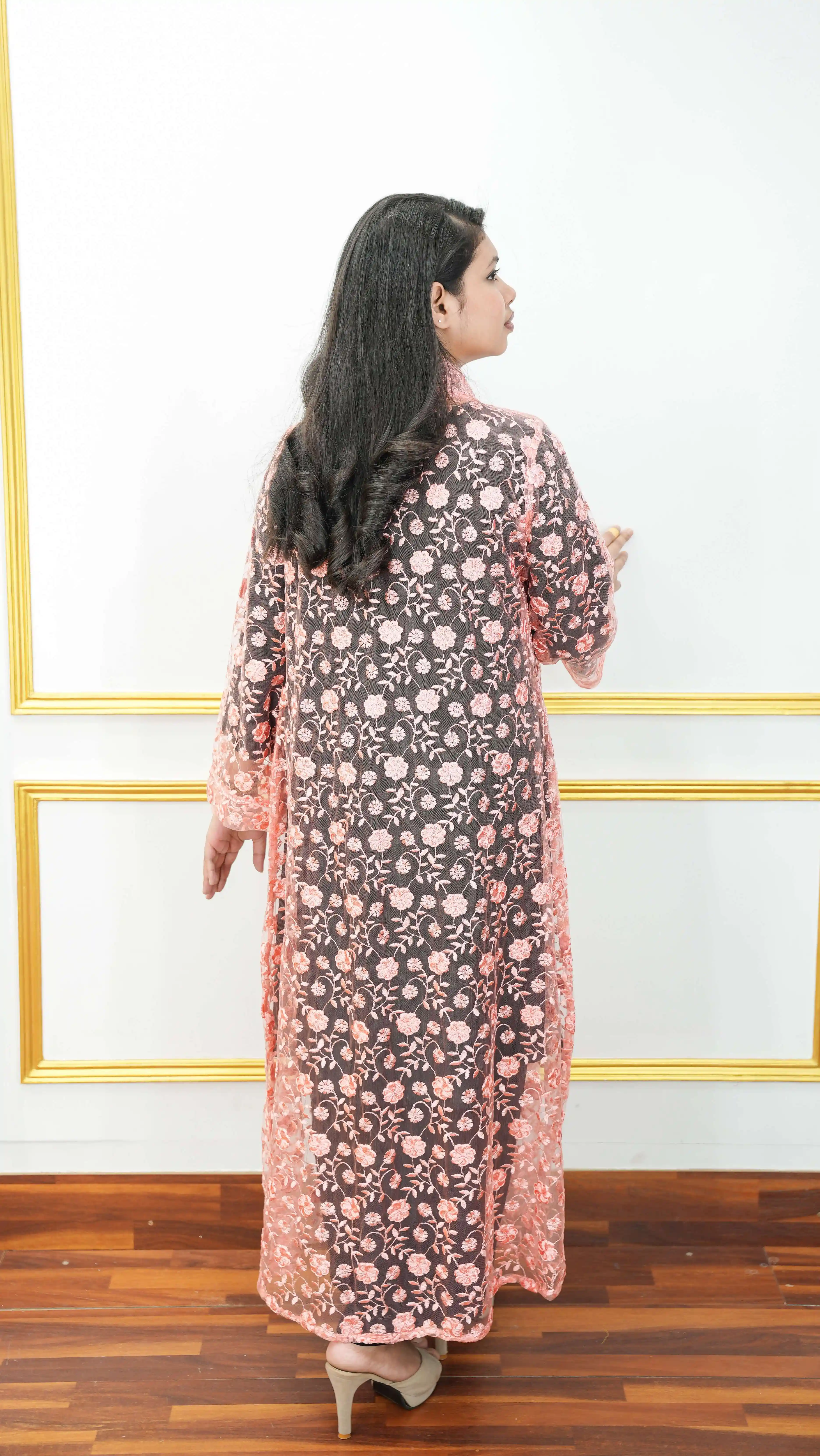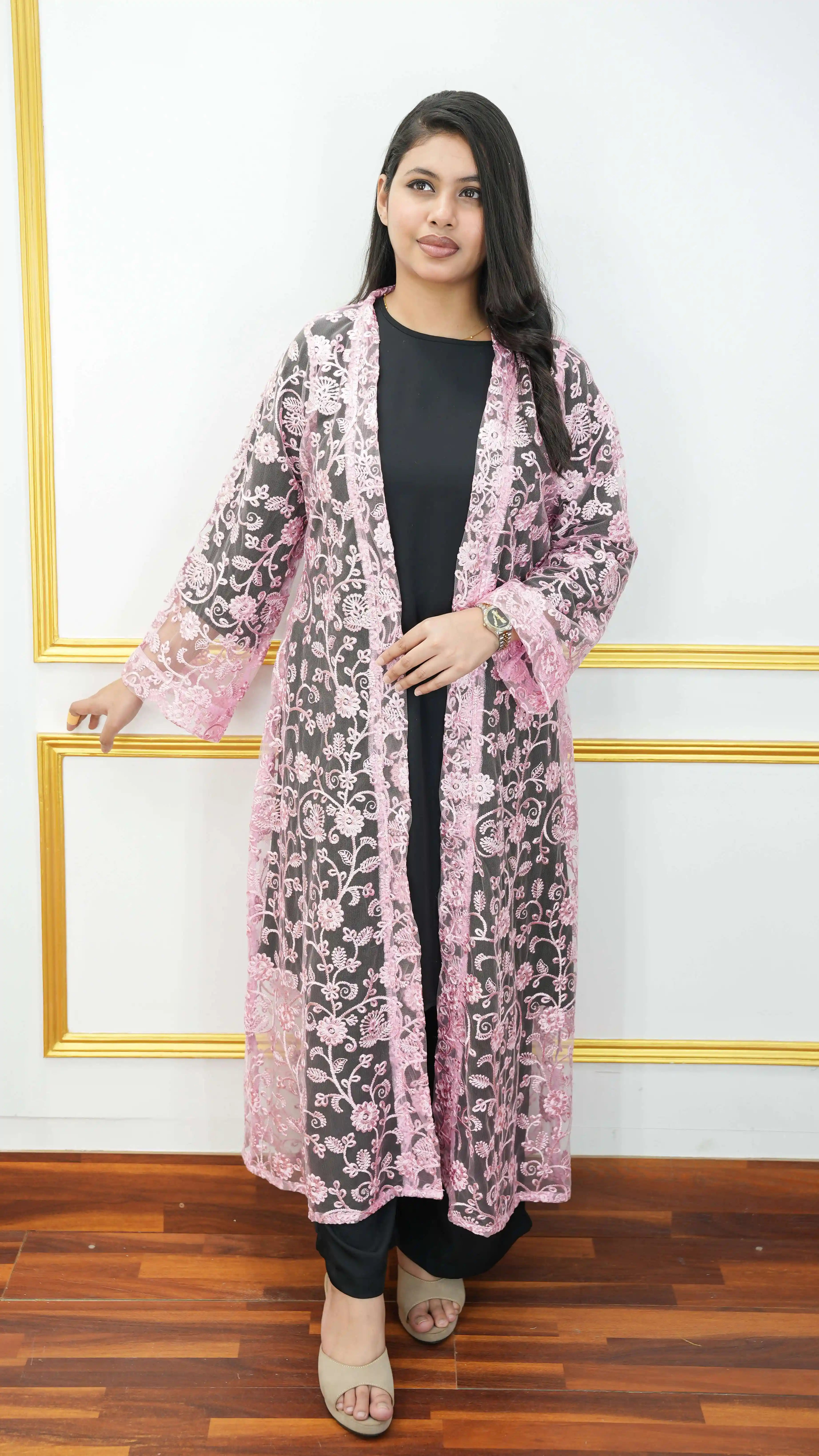 Elevate your style with this stunning long floral embroidery shrug crafted from luxurious sheer net fabric. Perfect for adding a touch of sophistication to any outfit, this versatile piece features intricate all-over floral embroidery that creates an elegant and timeless look.