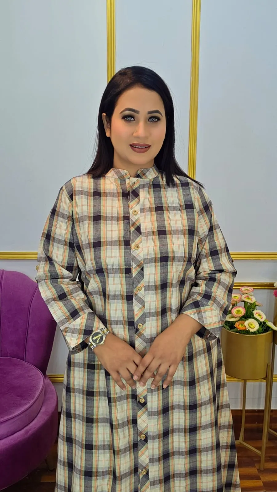 Stylish Long Shirt, crafted from premium pure cotton with a classic check pattern. The fully open button design and two functional pockets combine style and practicality, making it perfect for casual outings or office wear.