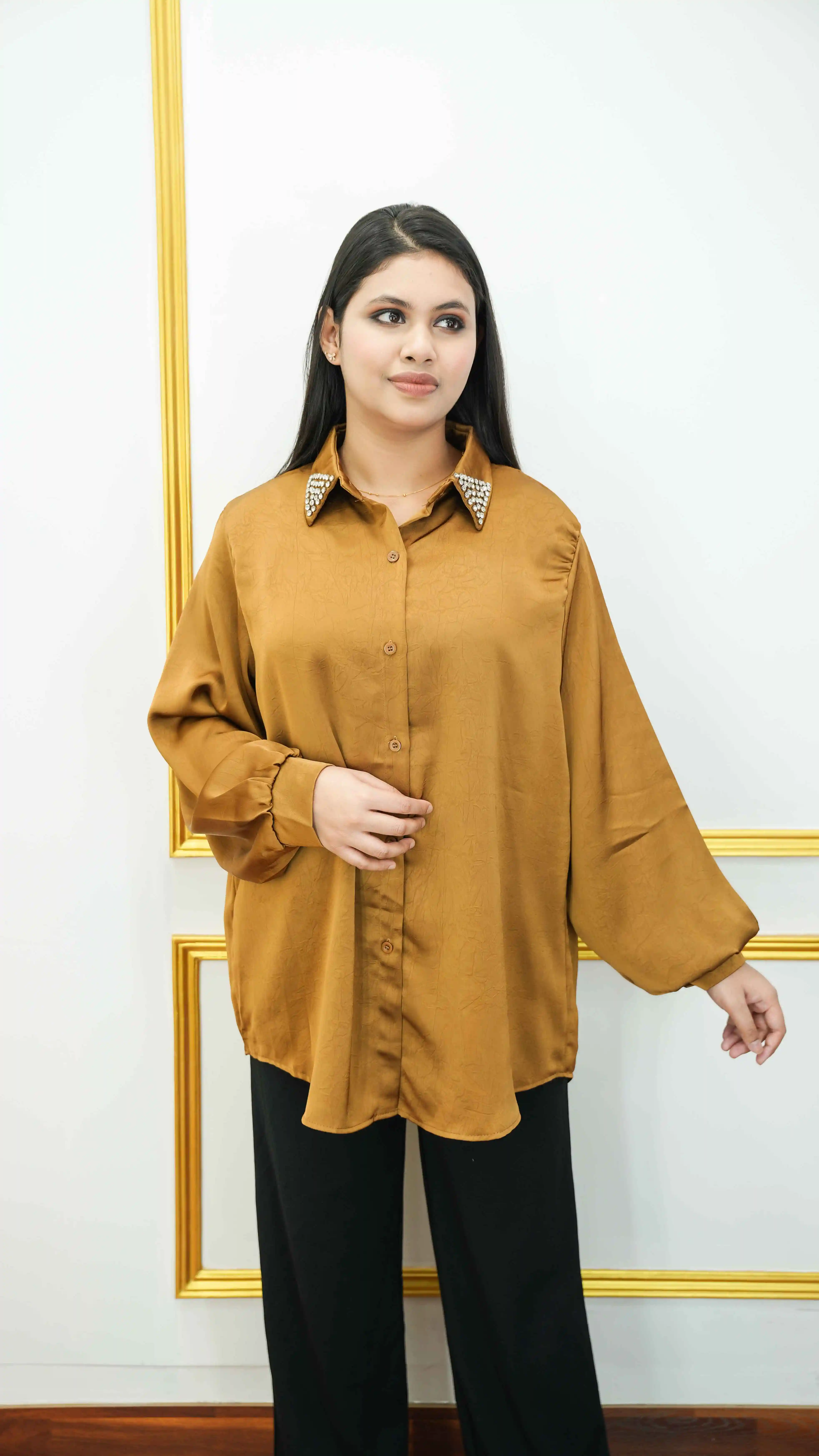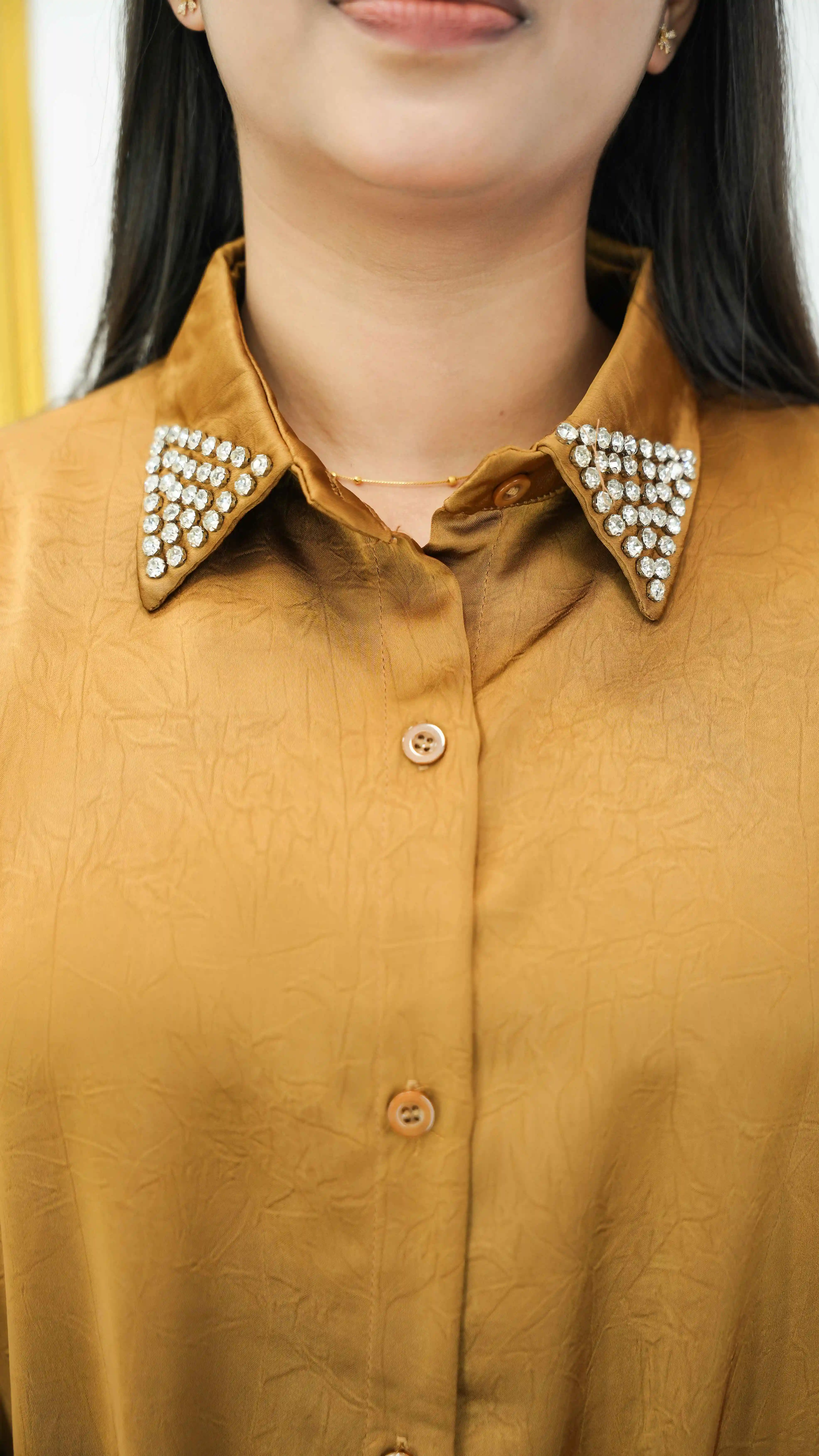 The decorative stone embellishments on both collar tips add a subtle touch of elegance, while the full-length sleeves ensure a polished silhouette. Finished in a hip-length cut, this shirt pairs effortlessly with trousers, jeans, or skirts.