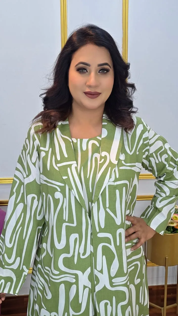 This Stylish Blazer Co-Ords Set, crafted from high-quality Imported Lilen fabric for unmatched comfort and elegance. Designed with a chic Blazer Neck, Double Part front, and Full Sleeve, this co-ords set delivers a sophisticated, trendy look suitable for both casual and semi-formal outings.