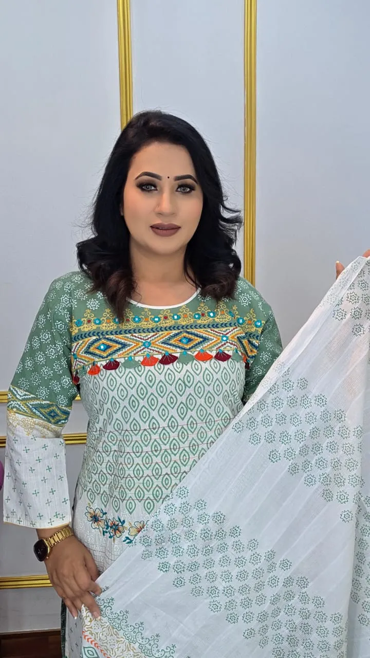 Add a touch of timeless elegance to your wardrobe with this Pure Cotton Ready Three Piece Set. Featuring intricate block prints across the body, orna, and pant, enhanced with delicate mirror and embroidery work, this set blends traditional charm with everyday wearability. Soft, breathable, and stylish—perfect for casual outings, family gatherings, or festive occasions.