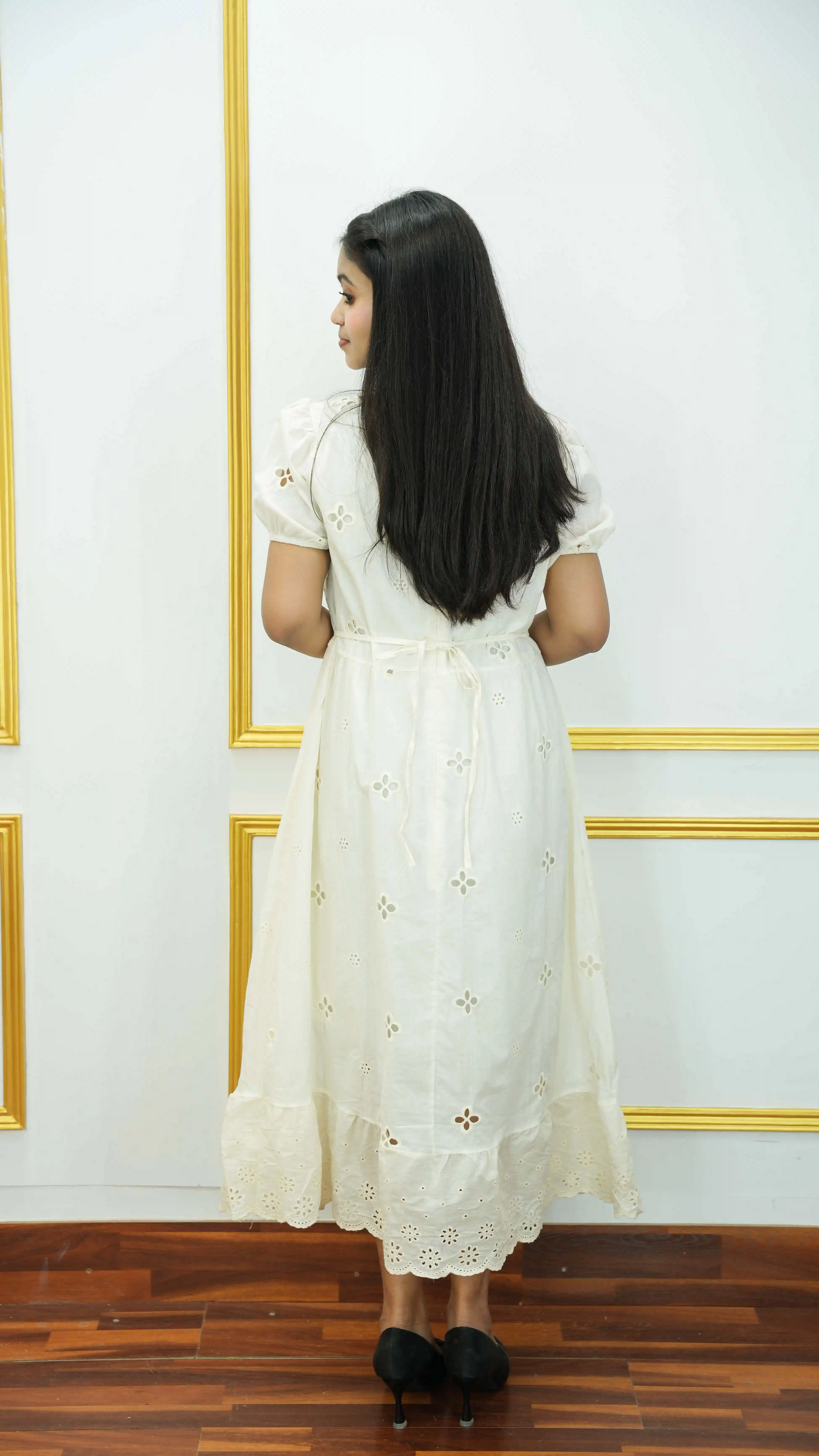 This premium Thai imported pure cotton gown, featuring exquisite hand-embroidered floral cutwork motifs. Perfect for casual outings, parties, or everyday wear, this gown combines comfort with style.