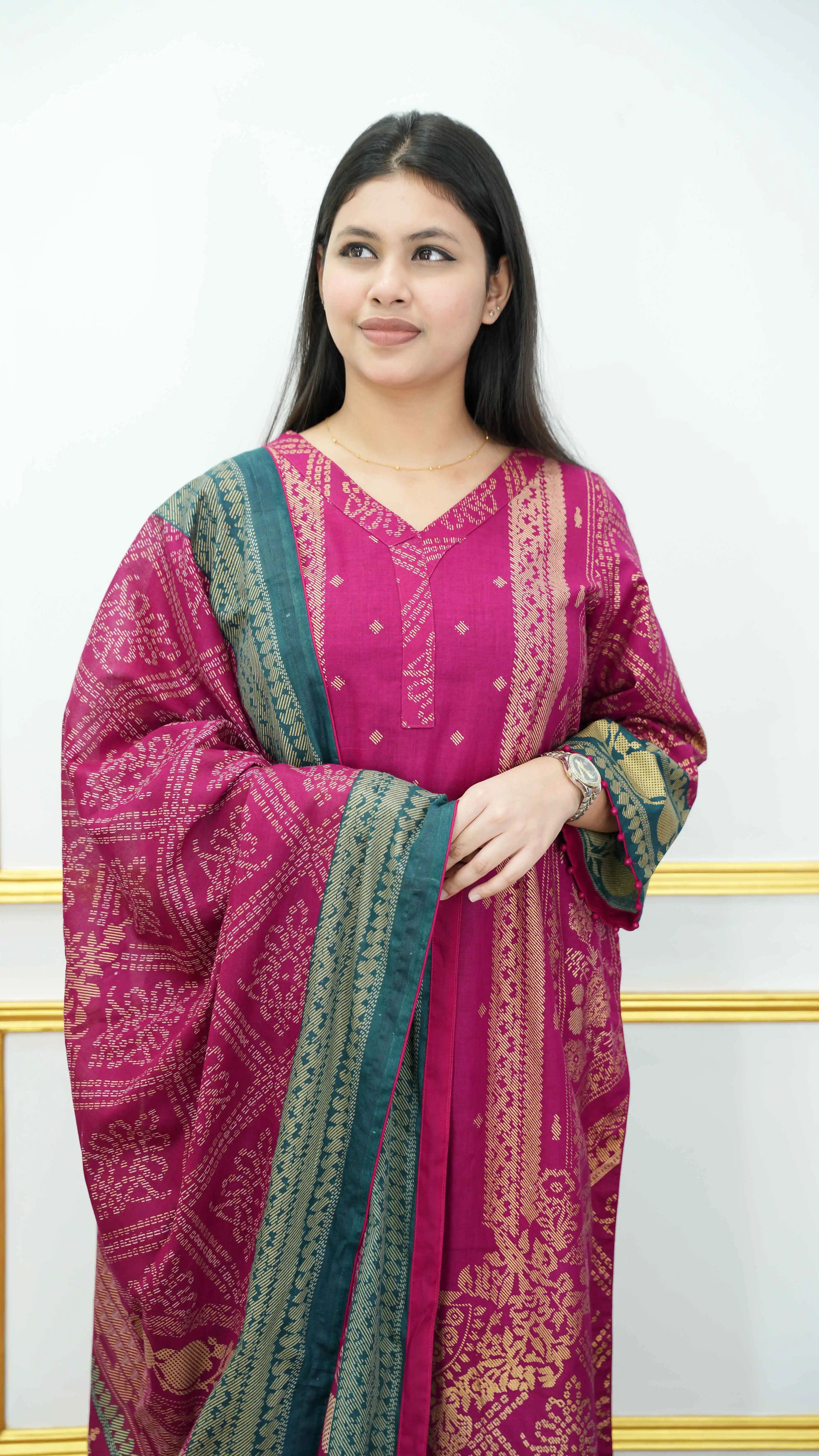 The outfit features an elegant golden motif print on the body and orna, creating a refined and graceful look. It is perfectly complemented by a deep magenta-colored pant, adding a bold yet sophisticated contrast. As an unstitched three-piece, it allows you to tailor the fit and style according to your personal preference.