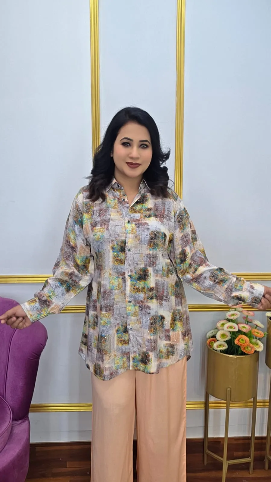 Step out in style with this elegant Co-ords Set crafted from premium Imported Lilen. Featuring a shirt collar, open button design, and subtle stone work, it offers a polished and chic look perfect for casual outings, office wear, or festive occasions.