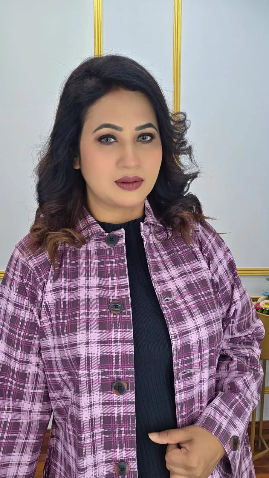 Featuring a shirt-style neckline collar, visible decorative buttons, and a timeless check pattern, this long blazer blends classic tailoring with modern fashion. The full-length sleeves and functional side pockets add practicality, while the extended length enhances a sleek, flattering silhouette.