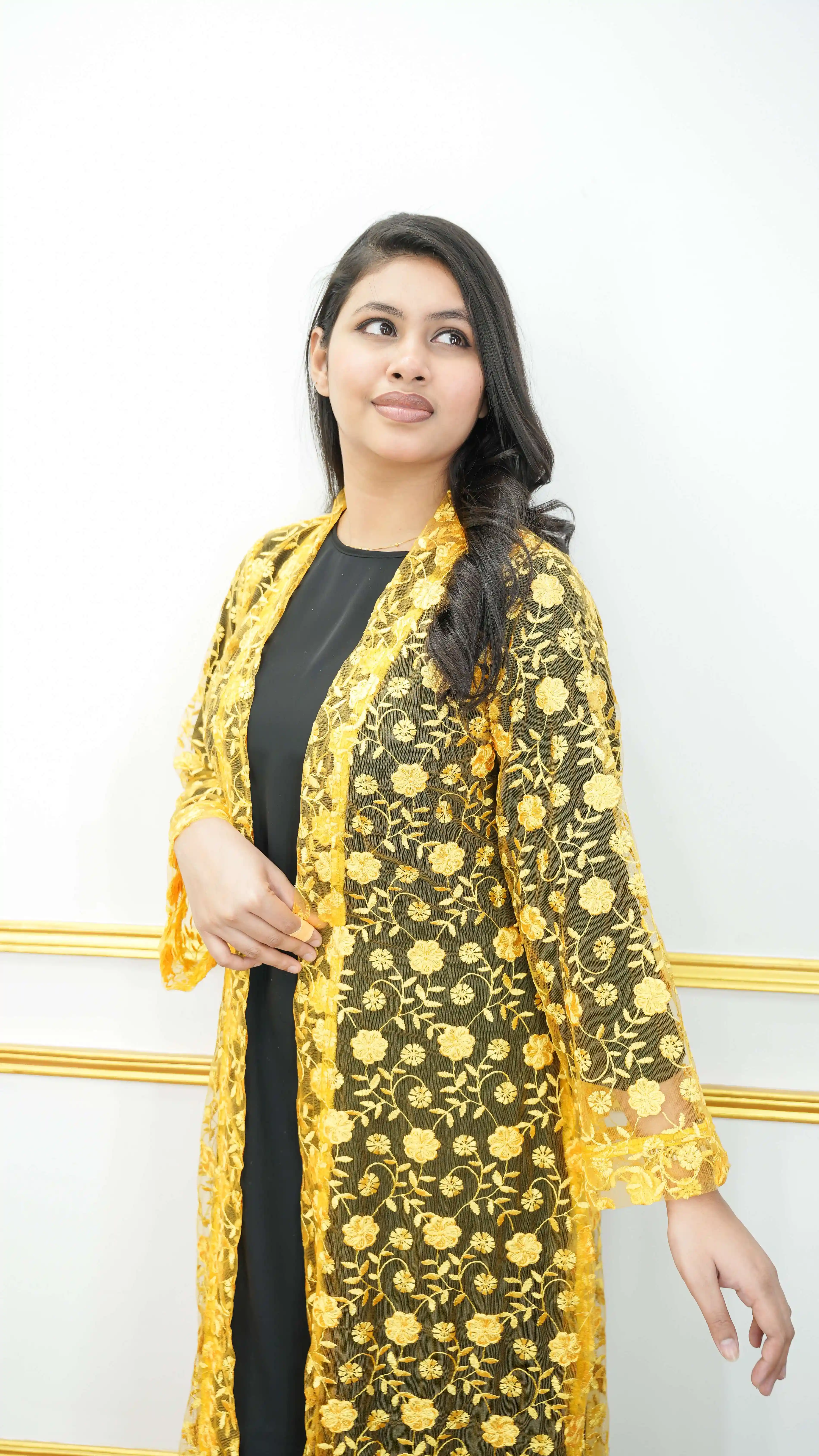 Elevate your style with this stunning long floral embroidery shrug crafted from luxurious sheer net fabric. Perfect for adding a touch of sophistication to any outfit, this versatile piece features intricate all-over floral embroidery that creates an elegant and timeless look.